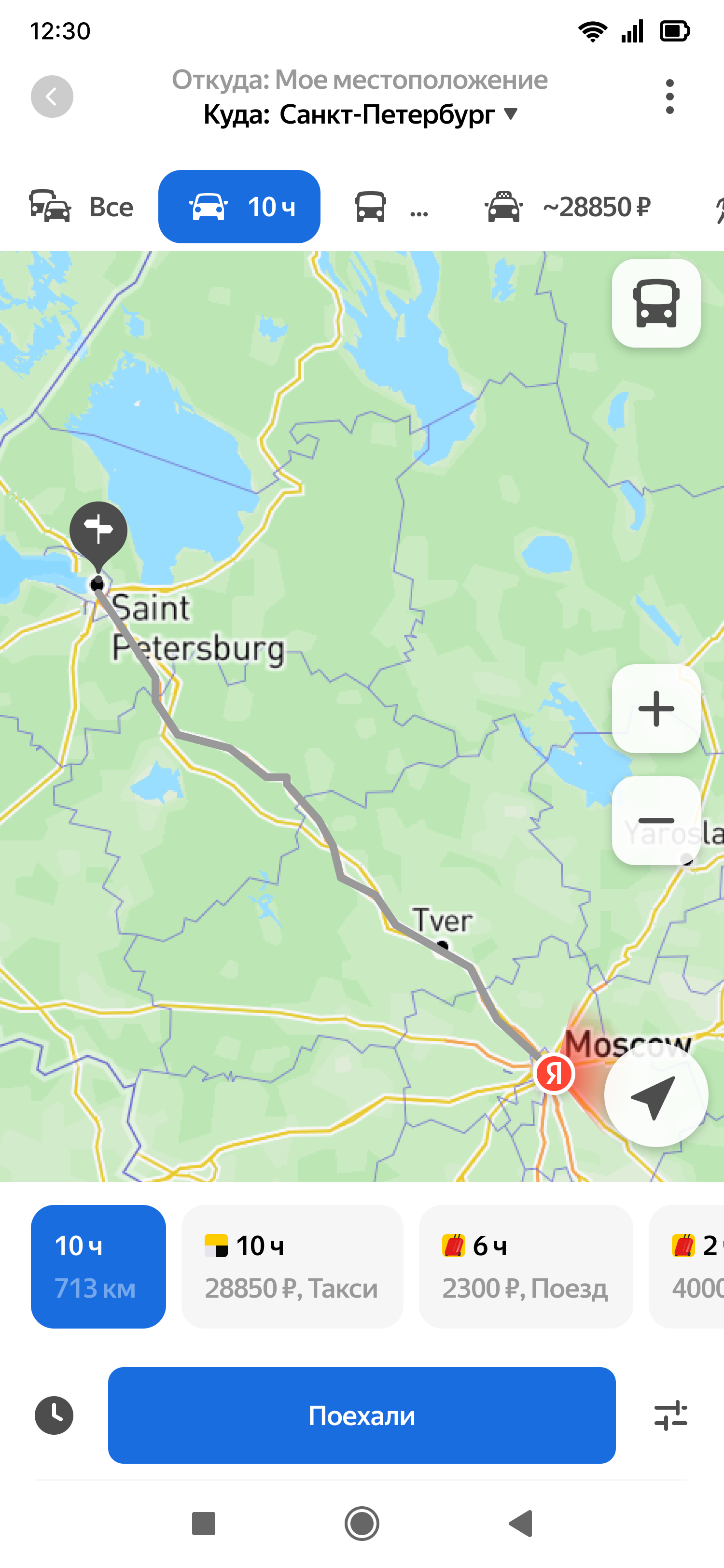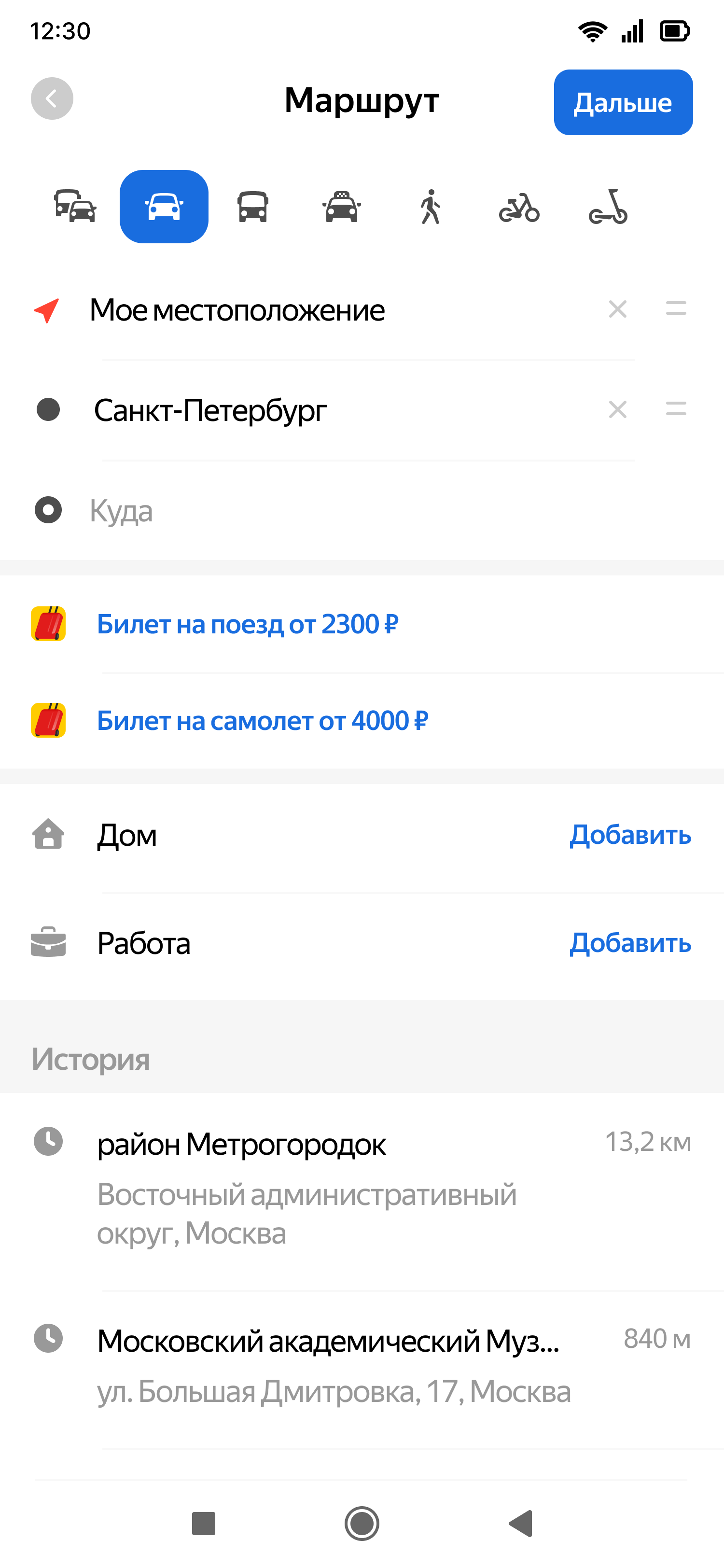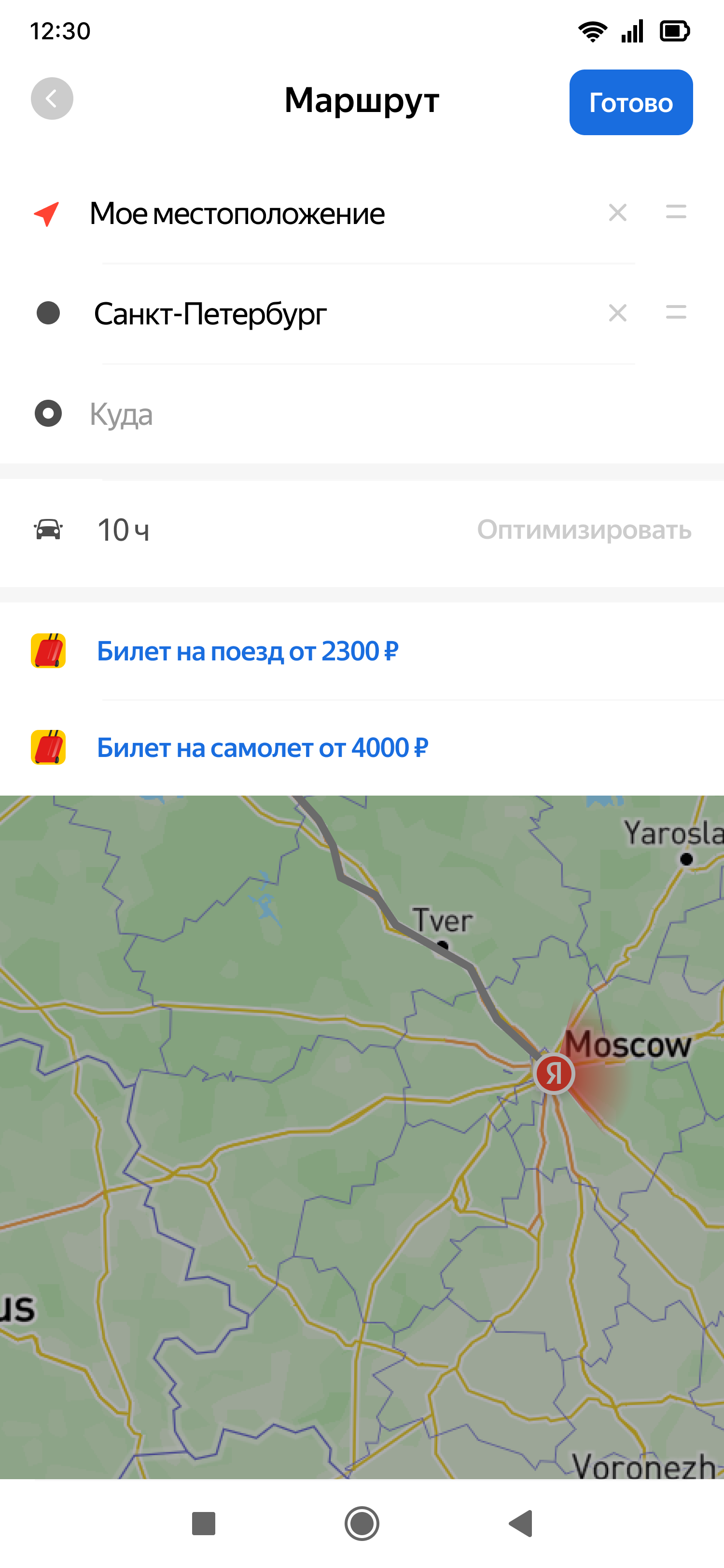 При построении междугороднего маршрута в Яндекс Картах пользователю предлагаются билеты на поезд и самолет